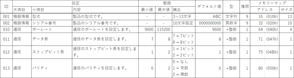 パラメーター仕様のまとめ方例を紹介します。下記は画像ですが、元となったExcelファイルを本ページの最後からダウンロードできるので、参考にどうぞ。