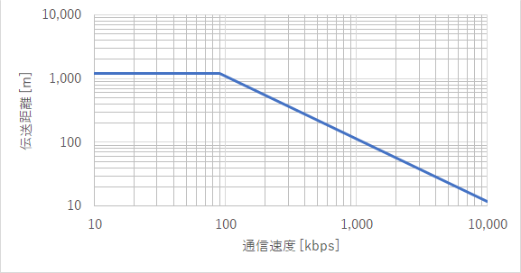 またRS-422や次のRS-485における、通信速度と伝送距離の関係の目安を下図に示します。12mでは10Mbps、1.2kmでは90kbpsとなります。