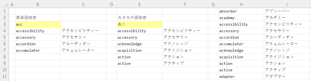今回の目標は下図のように、B3セルやE3セルに入力した文字に一致する単語を抽出します。抽出する元データはH~I列にあります。