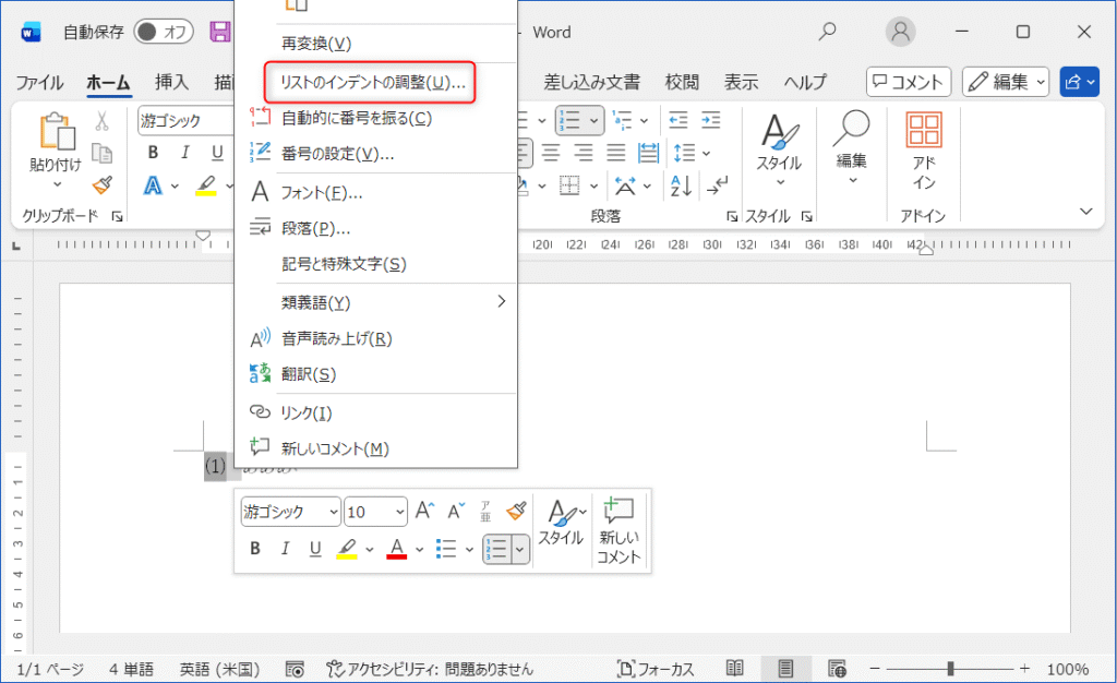 段落番号を右クリックして[リストのインデントの調整]をクリックします。