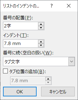 下図「番号の配置」にインデント量を入力して[OK]ボタンをクリックします。