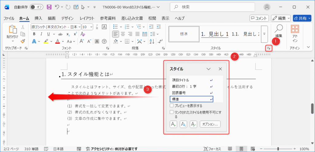 Wordのスタイルとはフォント、サイズ、色や配置といった書式設定を一元管理する機能です。スタイル機能を活用すると次のようなメリットがあります。