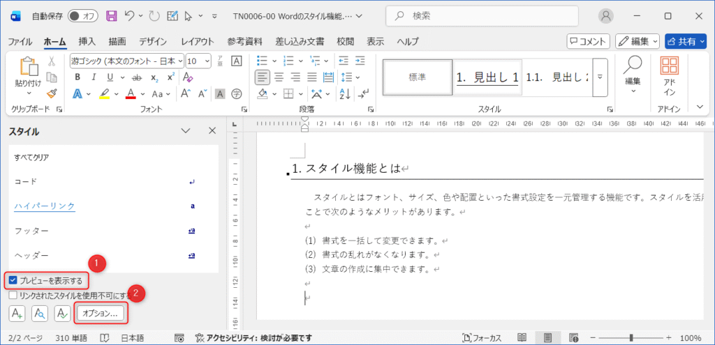 - アウトラインと組み合わせることで、章番号や節番号を自動採番できます。