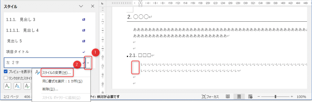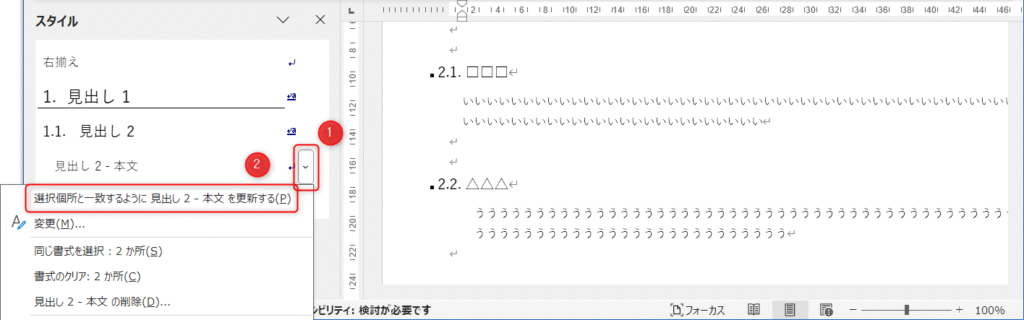 この書式を反映したい、元のスタイル「見出し 2 - 本文」にカーソルを合わせて、①→②の順にクリックします。