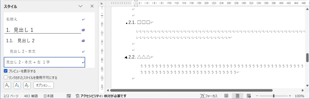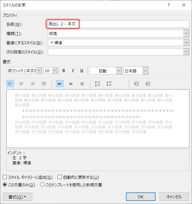いずれかの「見出し 2 - 本文」の、インデント量を「1字」に変更します。