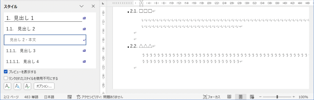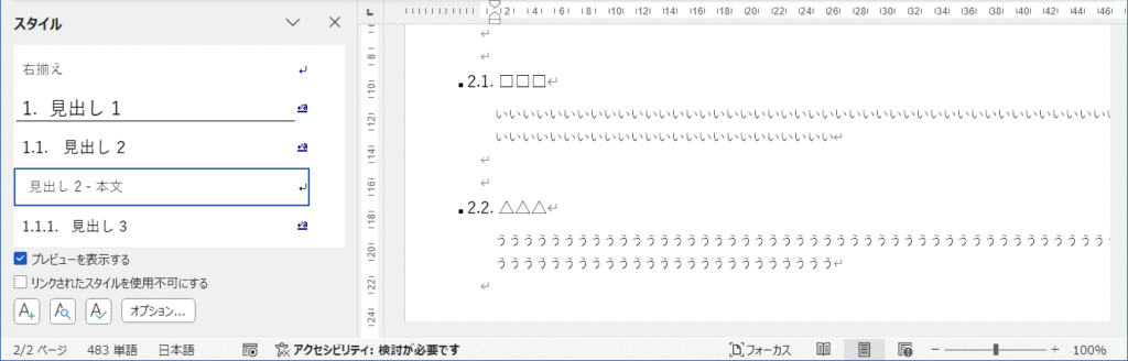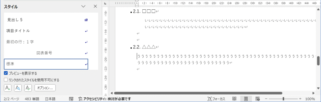登録したスタイルを反映する方法です。 ここでは先の例で登録した「見出し 2 - 本文」を別の見出し2に反映する方法を紹介します。