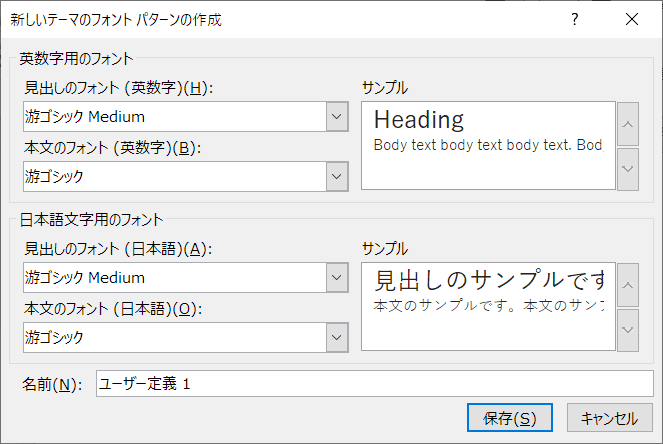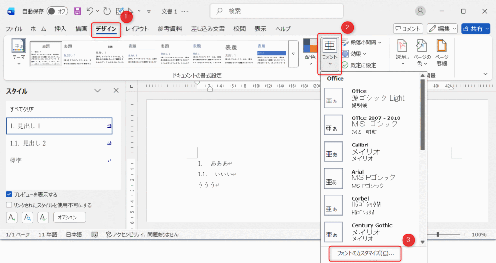 本文と見出しのフォントは、特殊な場所で設定されています。「標準」スタイルの書式を変更しても構いませんが、下記のように設定することを推奨します。