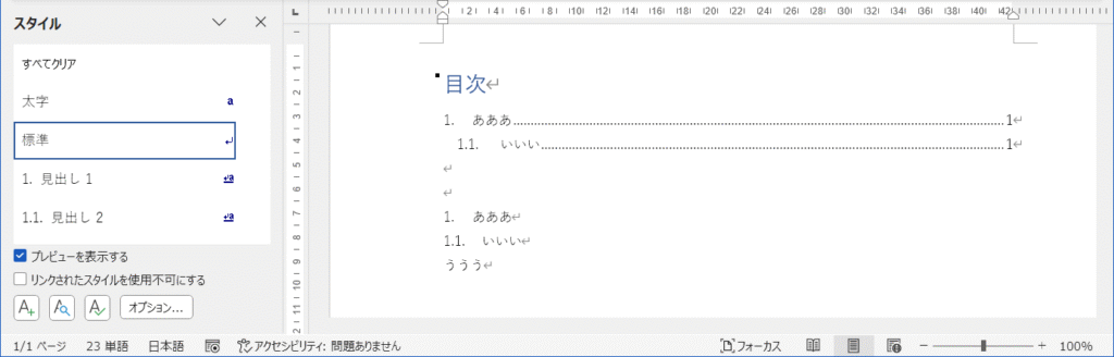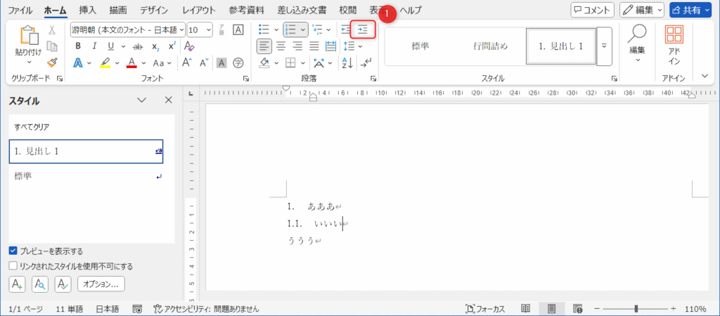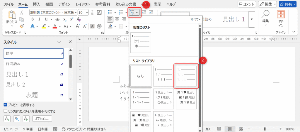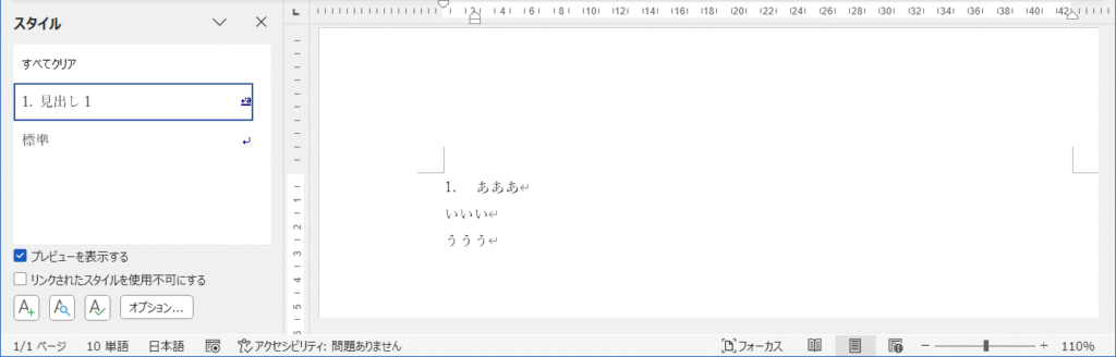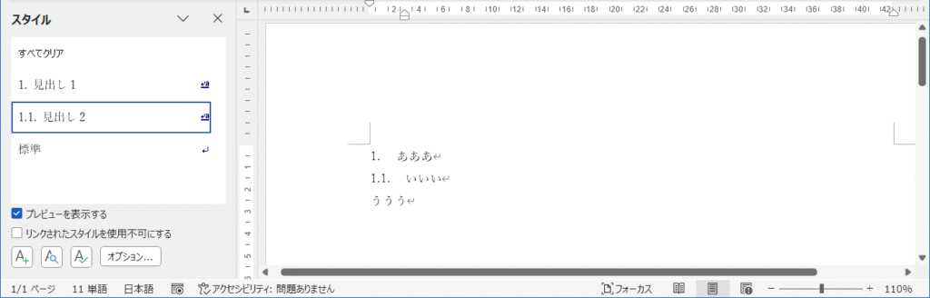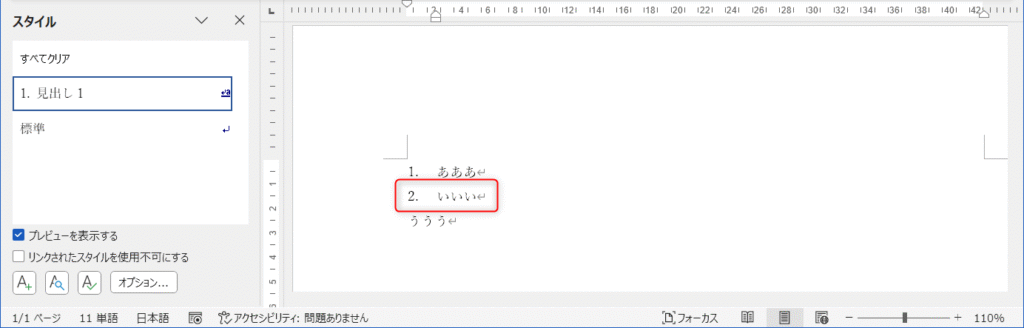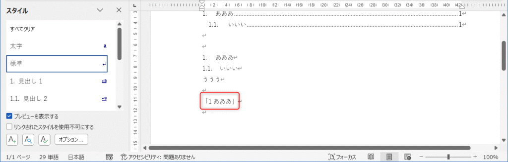 見出し番号と文字列が挿入されました。「1.あああ」としたい場合、「.」は手入力する必要があります。