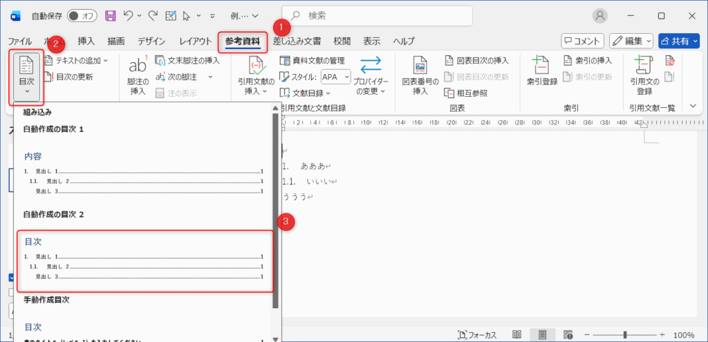見出しを正しく設定することで得られる恩恵の1つが目次の作成です。目次は下記のように作成します。