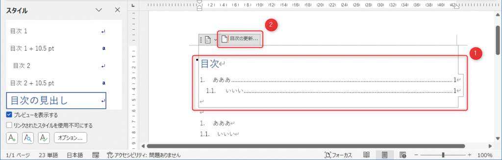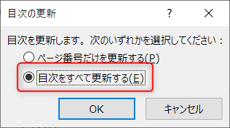 [目次をすべて更新する]にチェックを付け[OK]ボタンをクリックりします。