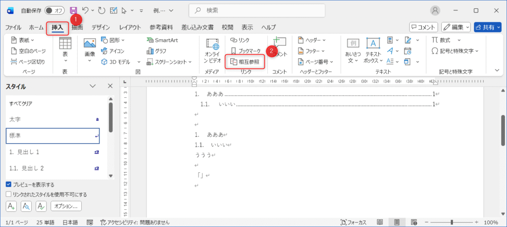 相互参照を更新する場合は、[Ctrl + A]キーで全選択した後、[F9]キーを押下してください。