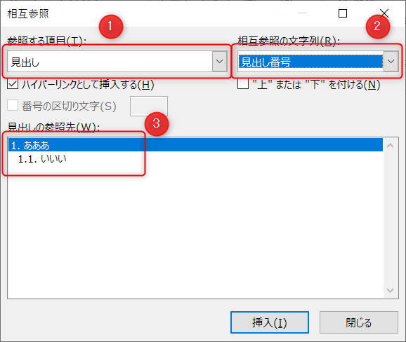 ①に「見出し」を、②に「見出し番号を」、③から相互参照したい見出しを選択し、[挿入]ボタンをクリックします。