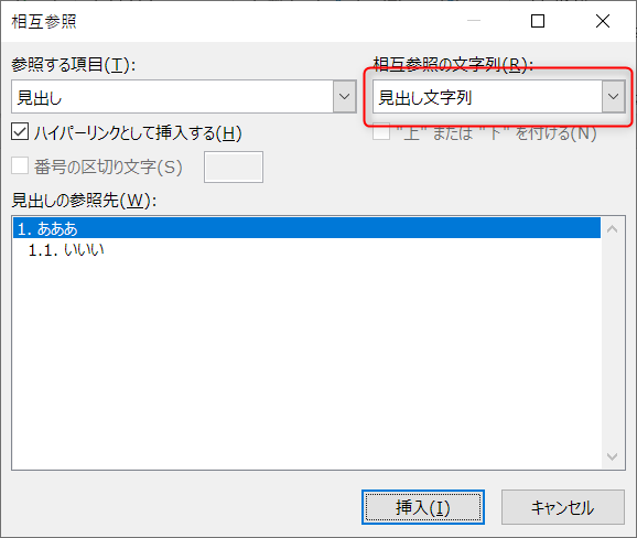 続けて「見出し文字列」を選択し、[挿入]ボタンをクリックします。