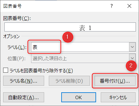 ①で「表」を選択します。数字以外を割り振りたい場合は、②から英字や漢数字などを選択できます。その後[OK]ボタンをクリックします。