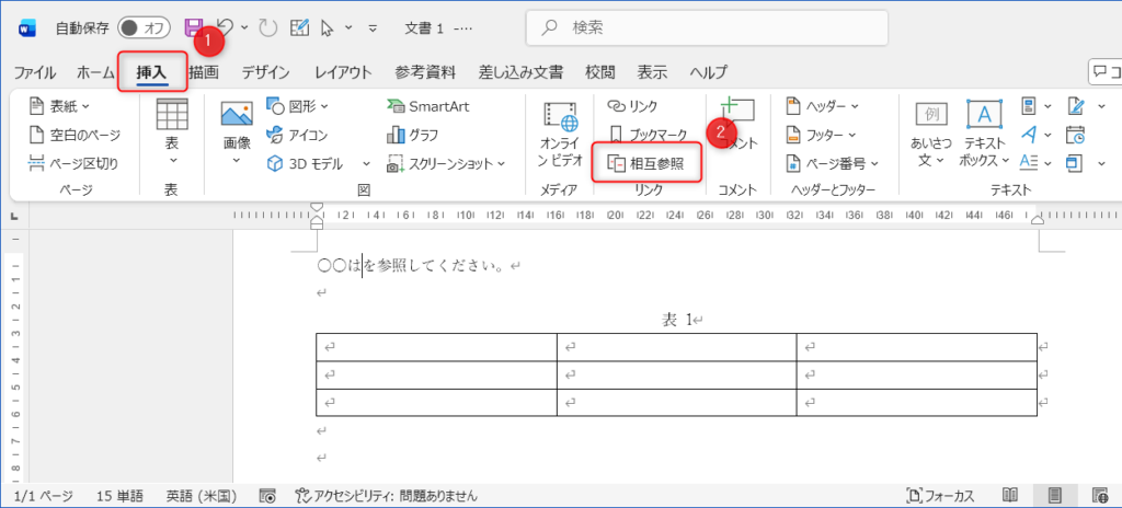 相互参照することで図表番号や文字列、ページ番号を本文中に埋め込むことができます。この機能を使用することで、図表番号やページ番号が変わった際に追従します。