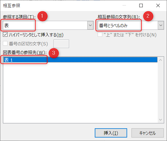 ①で「表」を選択し、②で「番号とラベル」を選択します。その後③から挿入したい表番号を選択し、[挿入]ボタンをクリックします。