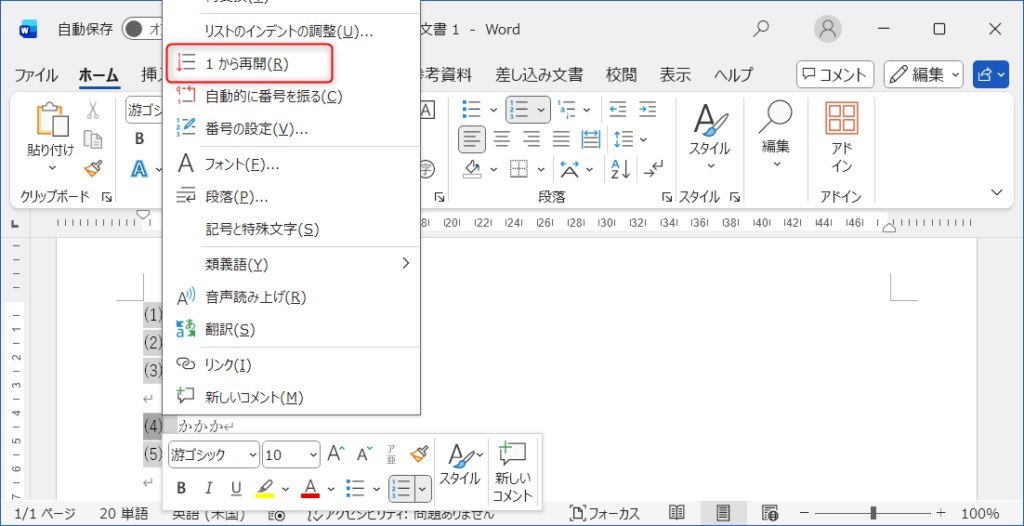段落番号を1番から始めるには段落番号を右クリックし、[1から再開]をクリックします。