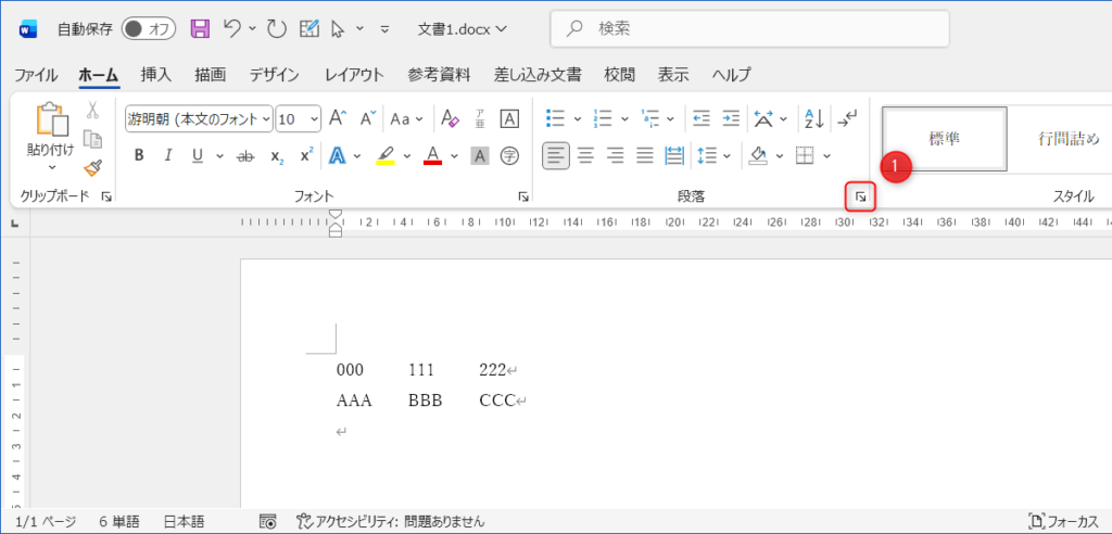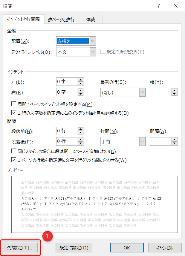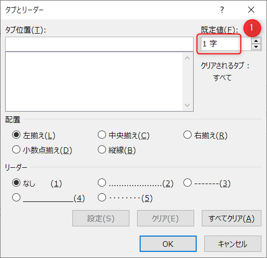 ①を「1字」に設定し、[OK]ボタンをクリックします。