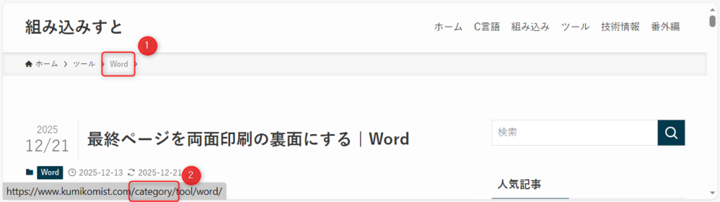 パンくずリストの①をクリックすると、固定ページではなくカテゴリーのリストが表示されます。②のとおりURLに「category」が入るためです。これを固定ページが表示されるようにします。