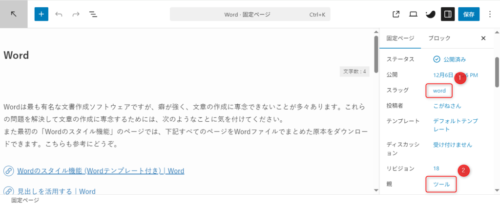 ①スラッグと、必要な場合は②親を設定します。