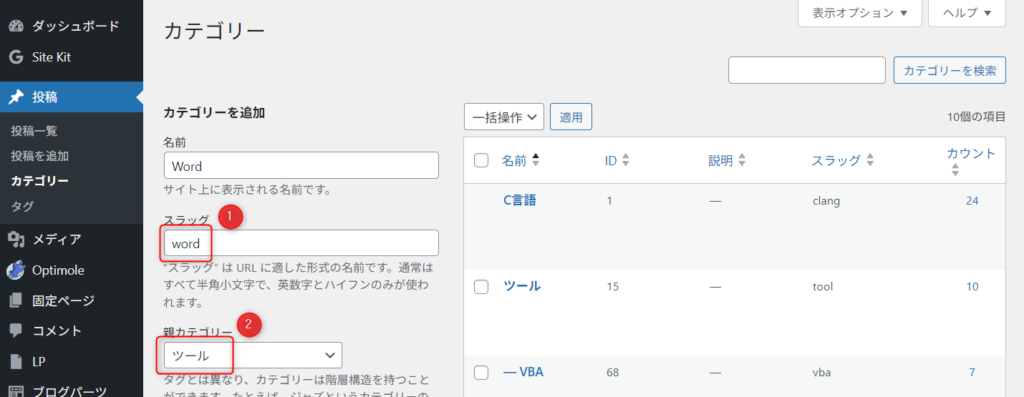 カテゴリーの①スラッグと、必要な場合は②親カテゴリーを設定します。